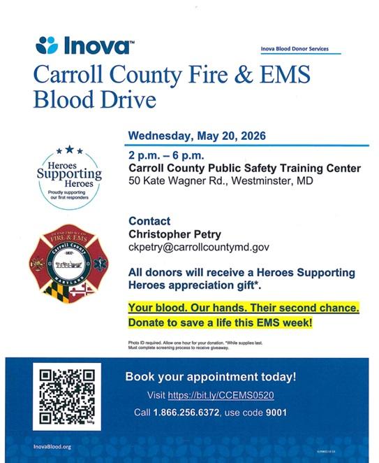To support this mission, Carroll County Fire & EMS will be hosting a blood drive in partnership with Inova Blood Services: